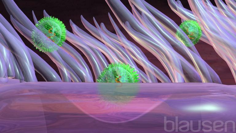 流行性感冒或流感是由几种类型的病毒之一引起,这些病毒可以通过空气中的悬浮颗粒迅速在人与人之间传播。如果吸入颗粒,它们将沿气管向下进入越来越小的气道。此时,病毒表面的突刺蛋白可能会与呼吸道内衬细胞上的其他蛋白结合。病毒随后被细胞吞噬,细胞充当病毒复制的工厂。新形成的病毒从细胞表面出芽,并传播到整个呼吸系统。