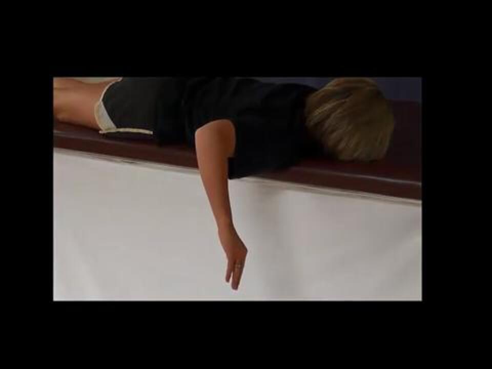 1. 俯卧于床上,受累侧手臂离开一侧床沿,肘部弯曲 90 度,拇指朝向身体。