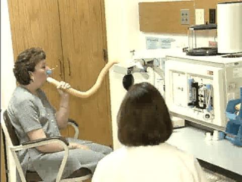 肺活量测定用于检查肺功能。首先,这名患者通过带有连接管的吸嘴正常呼吸,然后快速深吸气。之后迅速呼气,直到尽可能排空肺部空气。这些呼吸会通过肺活量计(右侧)进行测量,肺活量计上有一个黑色塑料附件,随每次完整呼吸升降。许多肺活量计是电子的,摒弃了随呼吸而移动的活塞或波纹管。