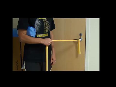 3. 受累手抓住弹力带,肘部弯曲 90 度,拇指向上。