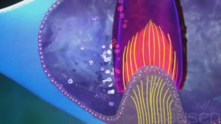 半规管从前庭后部突出并负责在三维空间平面中探测头部运动。前管感知前后运动。后管探测上下移动。侧管感知左右移动。每个管都含有一个膜性半规管,可感知角动量。每个管底部是一个称为壶腹的扩张。在壶腹内,长的毛细胞立体纤毛包埋在伸出到内淋巴中的顶帽内。当头部移动时,内淋巴推动顶帽并刺激立体纤毛。