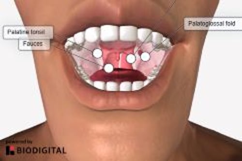 扁桃体位于后口咽的两侧。它们位于喉咙的前柱和后柱之间。