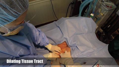 现在,小心地控制导线,将针从导线上取下。我们正在用手术刀切开皮肤。现在我们正在通过导线推进扩张器,以扩张穿过皮肤、皮下组织并进入锁骨下静脉的管道 。我们通过扭转动作推进扩张器,直到扩张器位于锁骨下线放置的扩张器中心。