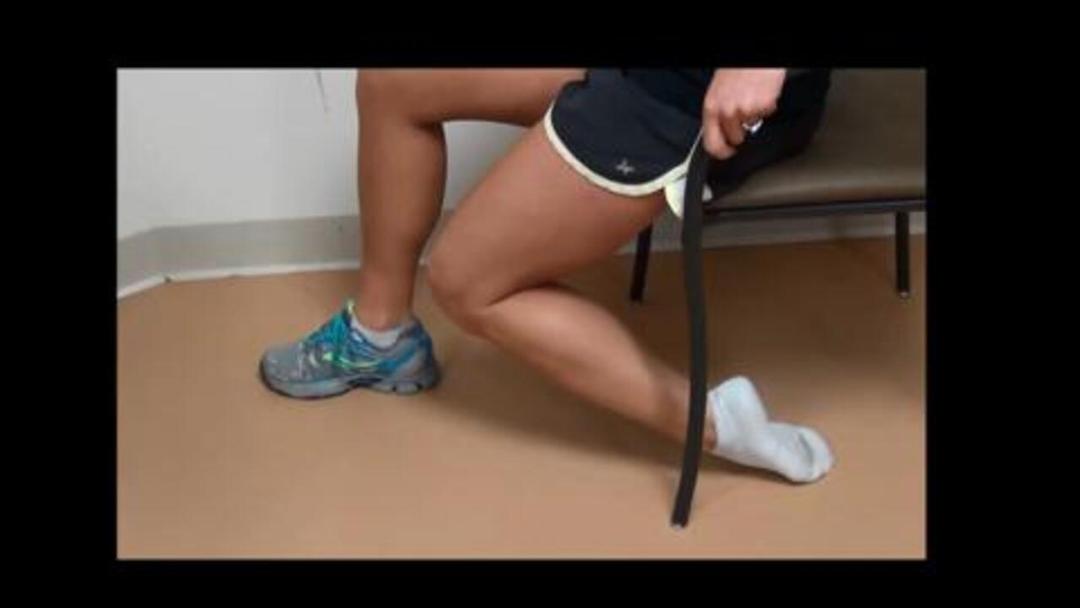 3. 慢慢地坐在椅子上,将脚推入跖屈,直到感觉到脚和脚踝的顶部有拉伸感。