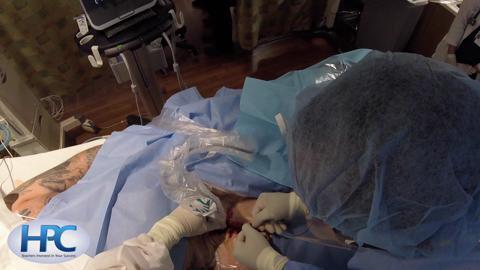 洗必泰拭子用于准备右侧腹股沟区域的皮肤。我们使用广泛的准备来准备右中心静脉导管插入。准备干燥后,我们将放置一个广泛的无菌屏障。无菌布单应覆盖整个下半身,包括患者和操作者之间的床。我们现在使用无菌保护套抓住顶部涂有非无菌超声凝胶的超声探头。您抓住超声探头,然后小心地将无菌护套拉到探头上,这样您就可以使用无菌探头进行实时超声检查。